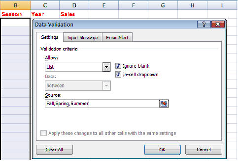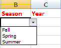 These are called data validation list boxes. Here’s how create them. In our example, Let us consider that you want the user to enter season in column B from a list of valid seasons. To create the List box for all cells in that column, select the entire column, except cell B1, and on the ribbon click <Data> à <Data Validation> This will activate the [Data Validation] dialogue box. The [Settings] tab, prompts you for the validation criteria. In the first list box captioned Allow, select the option ‘List’. Now in the third list box captioned Source, type out the valid list separated by commas or refer to the range where valid seasons have been entered.