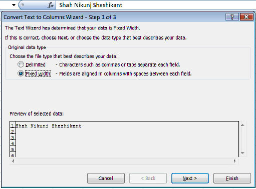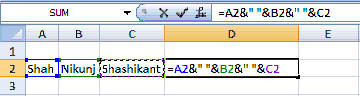 In step No 1 select the First radio button captioned <Delimited>, then click the <Next > button. In step No. 2, from the various types of Delimiters, select the check Box [Space]. You now see how the Full Name would be split into Surname, First Name and Middle Name. If you are fine with the display, click <Next>. In step No. 3, amongst other things, you are asked to provide the cell address from where you would like the split text to appear. That’s it, on the main screen wizard of step Three click <Finish>. You now see the Full Name split into Surname, First Name and Middle Name in three different cells. 12. Combine Text from Multiple Cells? Use the & (ampersand) operator Lets you combine text from multiple cells To combine text from multiple cells into one cell, use the & (ampersand) operator. Add a space between double quotes (“ “) to include a space in the combined text