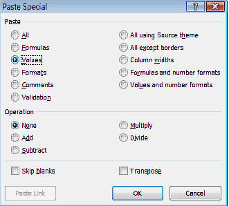 This formula evaluates to 200. This ‘200’ is the value of Cell B3. To copy and paste this Value i.e. 200, to the adjoining cell C3, go to cell B3, hit [CTRL + C], or right your mouse and select <Copy> from the shortcut menu that pops up. Go to cell C3 and click <Edit> <Paste Special>. A [Paste Special] dialogue box shall appear (See figure). . From the various options in the dialogue box, select the third option [Values] and click on <OK>. It’s done! Cell C3 now contains the value 200. In the same way you can copy and paste only the Formats (especially the conditional Formatting applied to a cell), Comments, Validation, etc, by selecting the appropriate button from the [Paste Special] dialogue box. 17. Convert Text to numbers? In the Paste Special, select ‘Operation’ – ‘Multiply’. It converts text (that appears as numbers) to numbers. Follow the following steps: