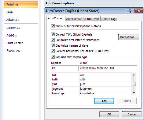 1. Create Shortcuts for commonly used words or phrases? Use the AutoCorrect feature. It creates shortcuts for commonly used words or phrases. Click Office Button à Excel Options à Proofing à AutoCorrect Options à AutoCorrect On the [AutoCorrect] tab check the option ‘Replace Text As You Type’