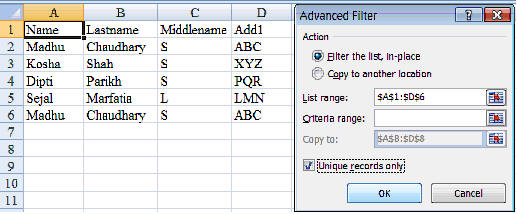 36. Remove duplicates / Filter Unique Records? You can use an Advanced Filter to extract a list of unique items in the list. To do this, click on <Data> filter <Advance filter>. In the [Advanced Filter] dialogue box that opens, check out the ‘Unique records only’ option (See figure below). That’s it. You are done.