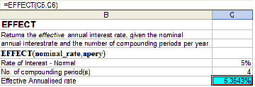 The formula used in the above screenshot counts the number of visible rows in column D. 40. Automatically summarize data by calculating subtotals? Use the Subtotal feature to do this. To insert subtotals into a list, first sort the list. Click a cell in the sorted list, and then click [Data] [Subtotal]. 41. Calculate subtotal within a subtotal? Uncheck ‘Replace Current Subtotals’ in the [Subtotal] dialogue box 1. First sort the list. 2. Click a cell in the sorted list, and then click [Data] [Subtotal]. 3. Repeate step No. 2, but Uncheck ‘Replace Current Subtotals’ in the [Subtotal] dialogue box 42. Which is one of the Best resources on Excel Charting? (see also “Part IV Links to Excel Resources) Check out http://peltiertech.com/. It is one of the best resources on Excel charting 43. Where do I find all the information I need for emailing from Excel? Check out Ron de Bruin Microsoft MVP – Excel site at http://www.rondebruin.nl/ Here you can find all the information you may ever need for emailing from Excel. 44. Calculate the effective annual interest rate where interest is compounded? Use EFFECT(nominal_rate,npery) function to calculate the effective annual interest rate, given the nominal annual interest rate and the number of compounding periods per year. Syntax EFFECT(nominal_rate,npery) Nominal_rate is the nominal interest rate. Npery is the number of compounding periods per year. e.g. 2 if compounded semi-annually, 4 if compounded quaterly. For e.g. where the nominal interest rate is 5.25% p.a. and the compounding is quaterly, the effective interest rate works out to be 5.3543%. See figure.