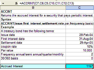 45. I am buying Government security that pays periodic interest. How do I calculate accrued interest on it? Use the AccruedInt() function to calculate accrued interest on a security that pays periodic payment. Syntax ACCRINT(issue,first_interest,settlement,rate,par,frequency,basis) Issue is the security's issue date. First_interest is the security's first interest date. Settlement is the security's settlement date. The security settlement date is the date after the issue date when the security is traded to the buyer. Rate is the security's annual coupon rate. Par is the security's par value. If you omit par, ACCRINT uses $1,000. Frequency is the number of coupon payments per year. For annual payments,frequency = 1; for semiannual, frequency = 2; for quarterly, frequency = 4. Basis is the type of day count basis to use. For e.g. see figure