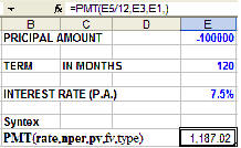 46. Calculate the payment for a loan (for e.g. EMI) based on constant payments and constant interest rates? Use the PMT() function to Calculate the payment for a loan (for e.g. EMI) based on constant payments and constant interest rates. Syntax PMT(rate,nper,pv,fv,type) Rate is the interest rate for the loan. Nper is the total number of payments for the loan. Pv is the present value, or the total amount that a series of future payments is worth now; also known as the principal. Fv is the future value, or a cash balance you want to attain after the last payment is made. If fv is omitted, it is assumed to be 0 (zero), that is, the future value of a loan is 0. Type is the number 0 (zero) or 1 and indicates when payments are due. For e.g. see figure