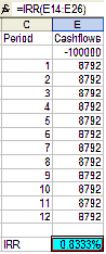 Note: you can also use PMT function to calculate payments to annuities other than bank loans. For e.g. you can calculate the amount required to be saved per month to accumulate a sum of amount at the end of a given period where your savings earn interest as well. 47. Calculate interest rate that I am actually paying (and the lender is earning) on my home loan or car loan? (i.e. internal rate of return for a schedule of periodic cash flows) Use the IRR function to calculate internal rate of return for a schedule of periodic cash flows. The cash flows do not have to be even, as they would be for an annuity. However, the cash flows must occur at regular intervals, such as monthly or annually. The internal rate of return is the interest rate received for an investment consisting of payments (negative values) and income (positive values) that occur at regular periods. For e.g. see figure