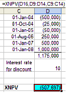 48. Calculate internal rate of return for a schedule of cash flows that is not necessarily periodic (for e.g. in case of businesses where cash inflows and outflows are not periodic)? Use the XIRR() function. It returns the internal rate of return for a schedule of cash flows that is not necessarily periodic. To calculate the internal rate of return for a series of periodic cash flows, use the IRR function. Syntax XIRR(values,dates,guess) Values is a series of cash flows that corresponds to a schedule of payments in dates. The first payment is optional and corresponds to a cost or payment that occurs at the beginning of the investment. If the first value is a cost or payment, it must be a negative value. All succeeding payments are discounted based on a 365-day year. 49. Calculate Net Present value for a schedule of cash flows that is not necessarily periodic? Use the XNPV() function to Calculate Net Present value for a schedule of cash flows that is not necessarily periodic. Syntax XNPV(rate,values,dates) Rate is the discount rate to apply to the cash flows. Values is a series of cash flows that corresponds to a schedule of payments in dates. The first payment is optional and corresponds to a cost or payment that occurs at the beginning of the investment. If the first value is a cost or payment, it must be a negative value. All succeeding payments are discounted based on a 365-day year. The series of values must contain at least one positive value and one negative value. Dates is a schedule of payment dates that corresponds to the cash flow payments. The first payment date indicates the beginning of the schedule of payments. All other dates must be later than this date, but they may occur in any order.