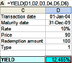 50. Calculate yield of a bond that pays periodic interest? Use the YEILD() function to calculate yield of a security that pays periodic interest. Syntax YIELD(settlement,maturity,rate,pr,redemption,frequency,basis) Important Dates should be entered by using the DATE function, or as results of other formulas or functions. For example, use DATE(2008,5,23) for the 23rd day of May, 2008. Settlement is the security's settlement date. The security settlement date is the date after the issue date when the security is traded to the buyer. Maturity is the security's maturity date. The maturity date is the date when the security expires. Rate is the security's annual coupon rate. Pr is the security's price per $100 face value. Redemption is the security's redemption value per $100 face value. Frequency is the number of coupon payments per year. For annual payments, frequency=1; for semiannual, frequency = 2; for quarterly, frequency = 4. For e.g. see figure
